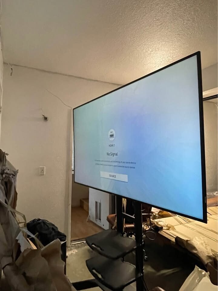 롤링 스텐드에 올려져 있으며, 4k HDMI / Powercable 포함입니다.