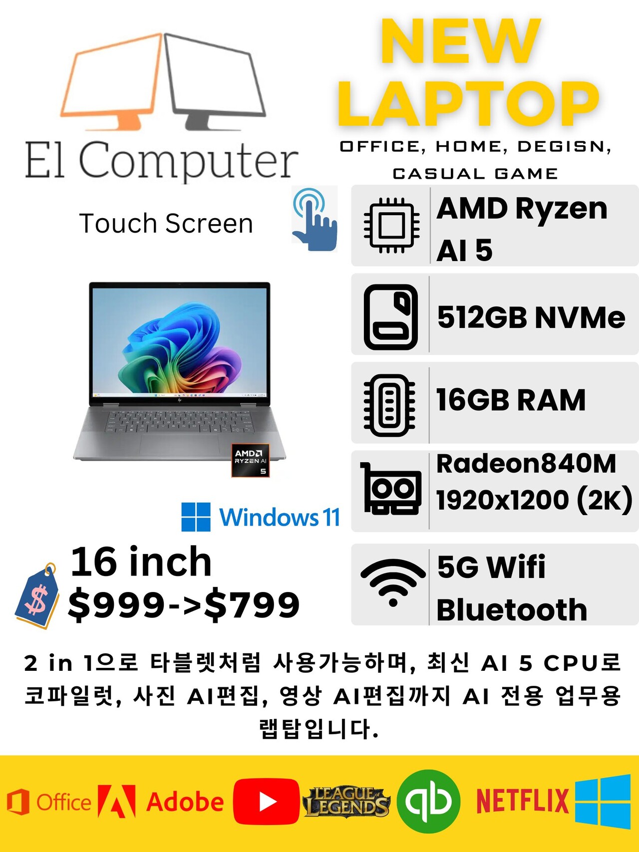 2 in 1으로 타블렛처럼 사용가능하며, 최신 AI 5 CPU로 코파일럿, 사진 AI편집, 영상 AI편집까지 AI 전용 업무용 랩탑입니다.