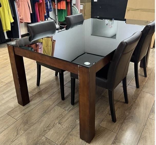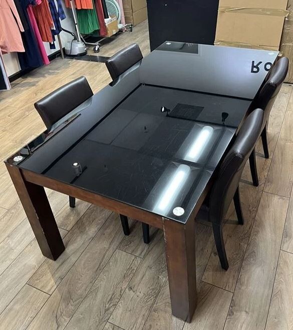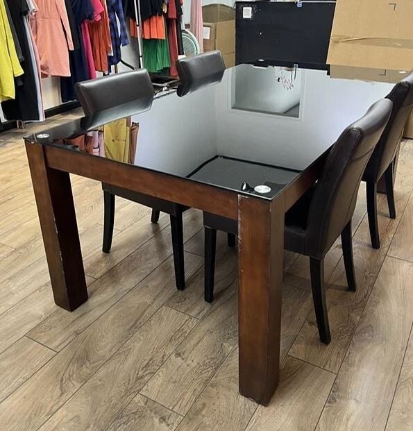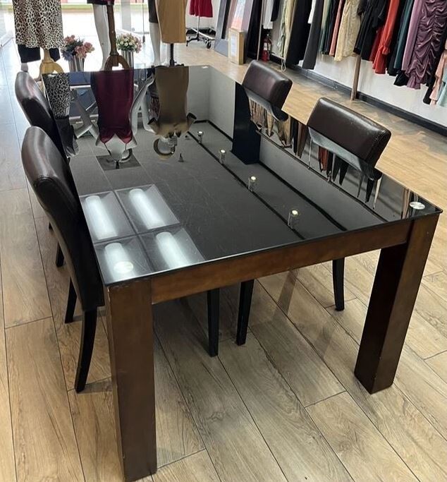 이 테이블은 두꺼운 검은색 강화 유리 상판과 견고하고 내구성이 뛰어난 원목 프레임을 특징으로 하는 다용도 모던 회의용 테이블입니다. 사무실 회의실, 작업 공간, 부티크 및 소매점 환경과 같은 전문적인 공간에 완벽하게 어울립니다.