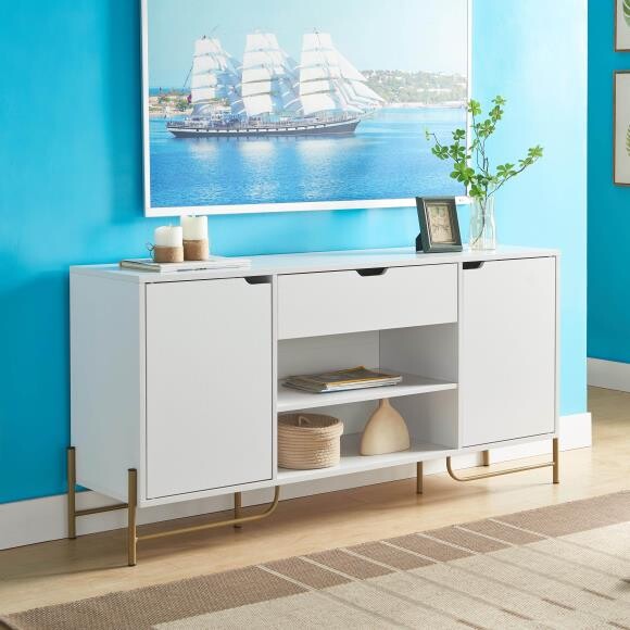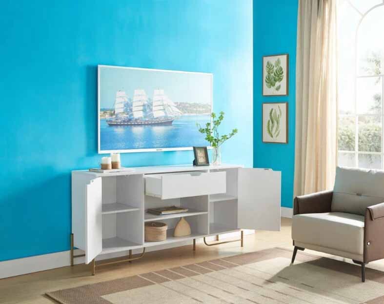 효율적인 수납 구조: 중앙 서랍과 오픈 선반, 양쪽 수납장까지 있어 거실 수납 고민을 한 번에 해결해 줍니다.