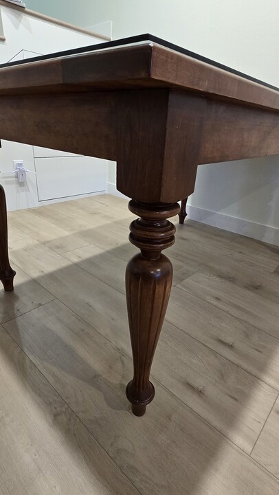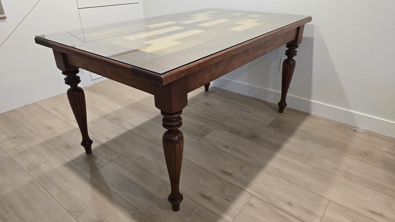 원목으로 되어있고 유리 탑이 있는 식탁입니다.