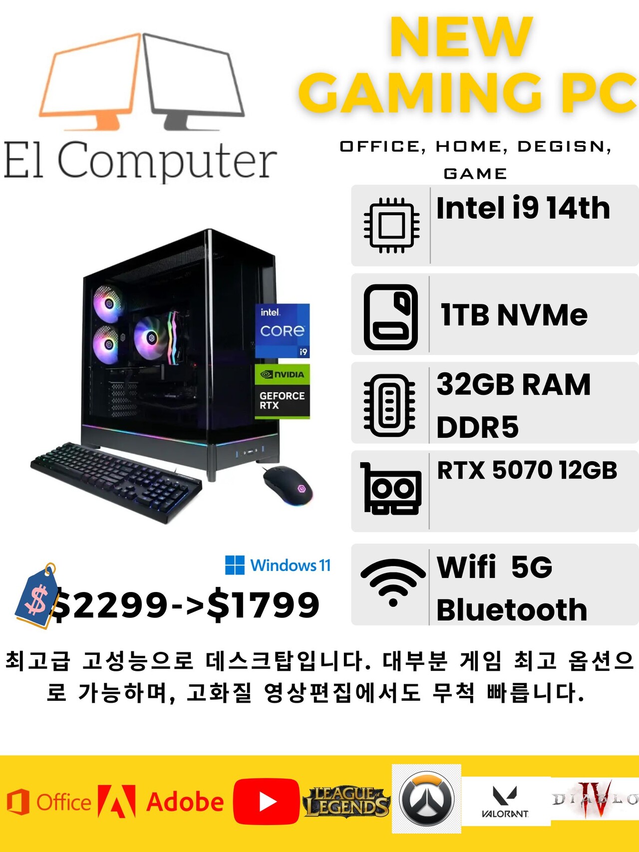 최고급 i9와 빠른 NVMe 하드, 최고급 그래픽 카드로 최고성능게임, 최고급영상편집, 문서용으로 사용하기 좋은 데스크탑입니다.