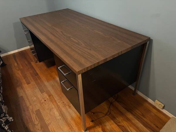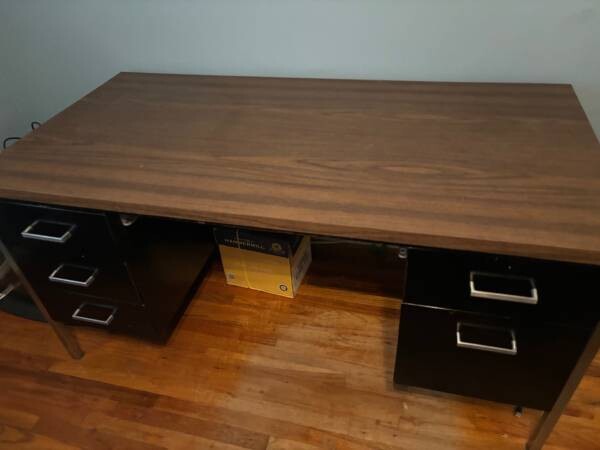 (1) 책상 A metal desk with wood veneer top. 60w x 30d x 29h.
