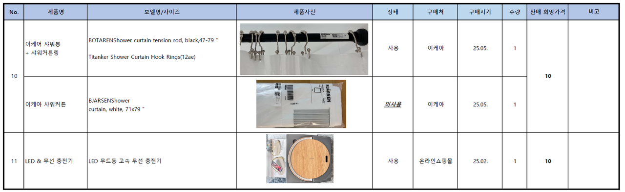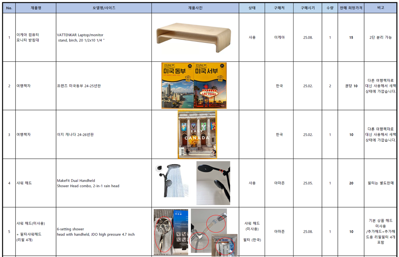 잡화: 이케아 모니터 받침대, 여행책자(미국,캐나다), 샤워해드, 유리빨대 컵, 이케아 어린이 의자, 휴대용 버너, 샤워봉(링, 커튼), LED 무선충전기