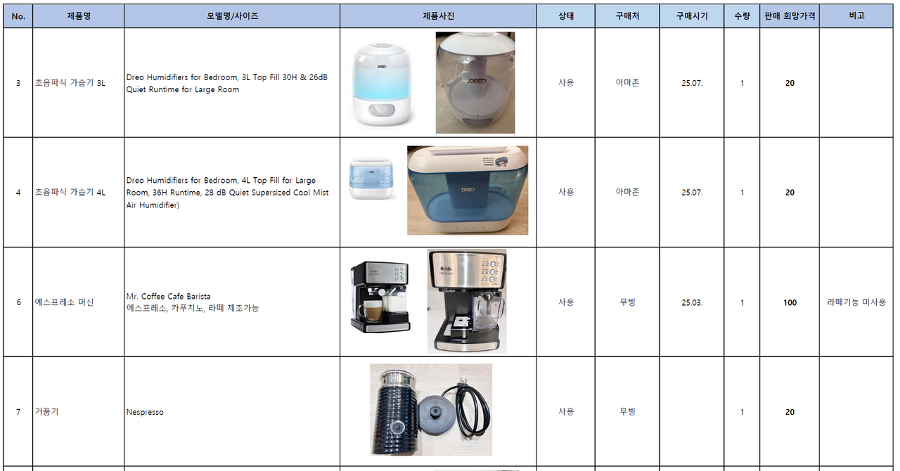 가전: 가습기, 에스프레소 머신, 거품기, 공기청정기, 미니PC, 공유기, 로지텍 무선키보드