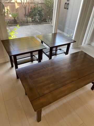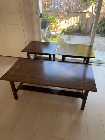 Brown Solid Wood Coffee Table 46W x 23D x 18H Matching end tables 23 x 21D x 21H.