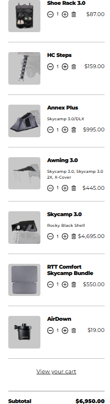 - Upgraded inflatable mats (RTT Comfort Skycamp Bundle) + Ikamper AirDown.