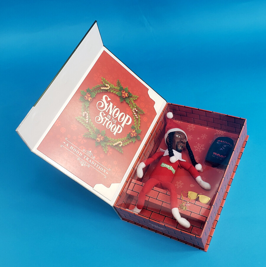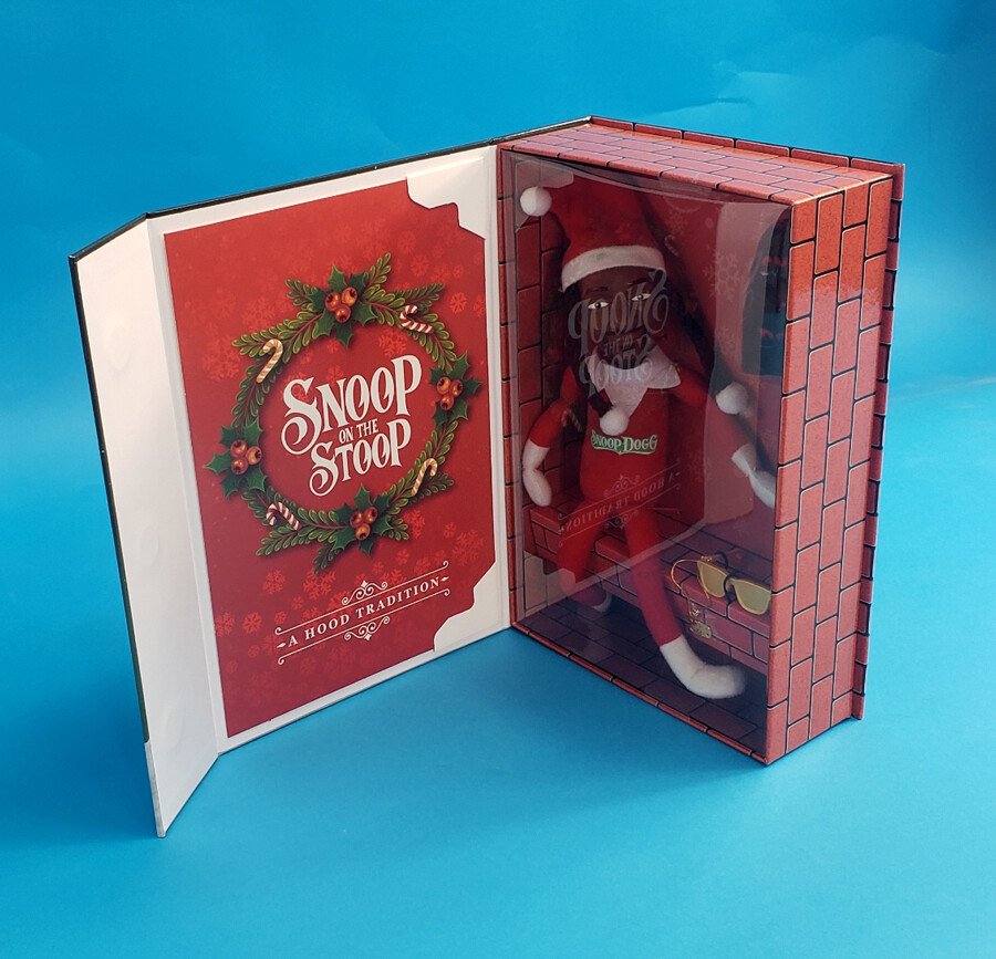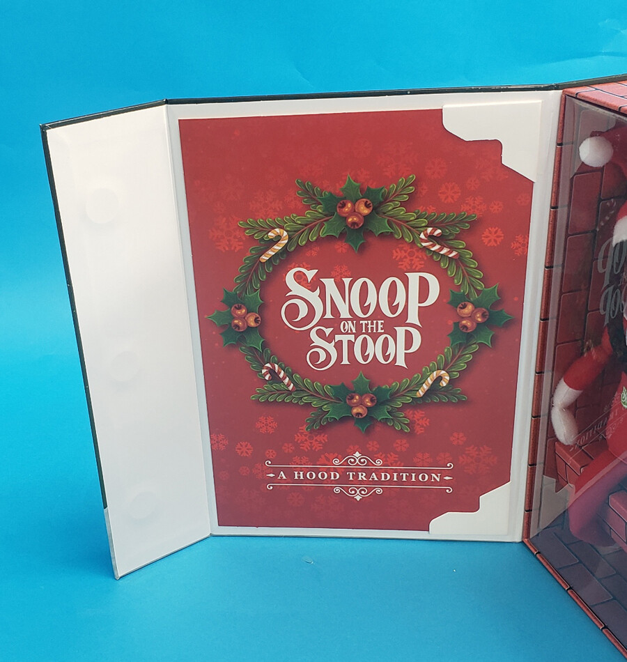 "스눕 온 더 스툽(Snoop on the Stoop)"은 10.5~12인치 크기의 크리스마스 봉제 인형으로, 선글라스와 체인을 착용한 홀리데이 엘프 차림의 스눕 독을 연상시킵니다. "선반 위의 엘프(Elf on the Shelf)" 전통에서 영감을 받은 수집용 홀리데이 장식으로, 다양한 소매점에서 판매되고 있다.*****