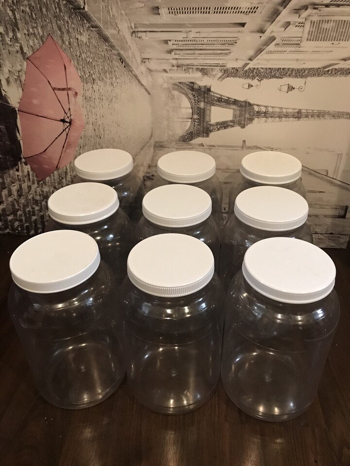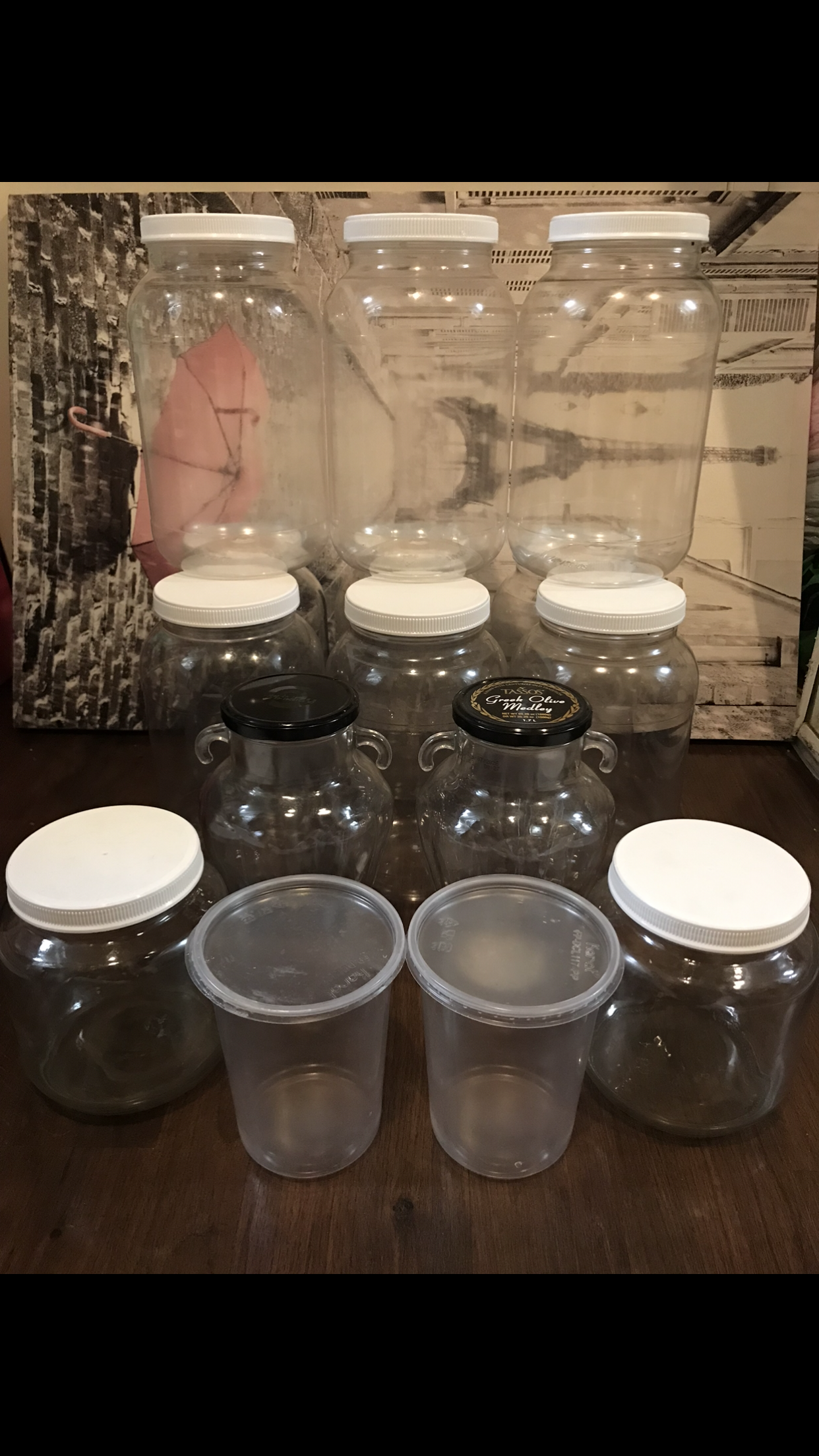 큰 사이즈 플라스틱 김치병 10개와 피클 유리병 2개,