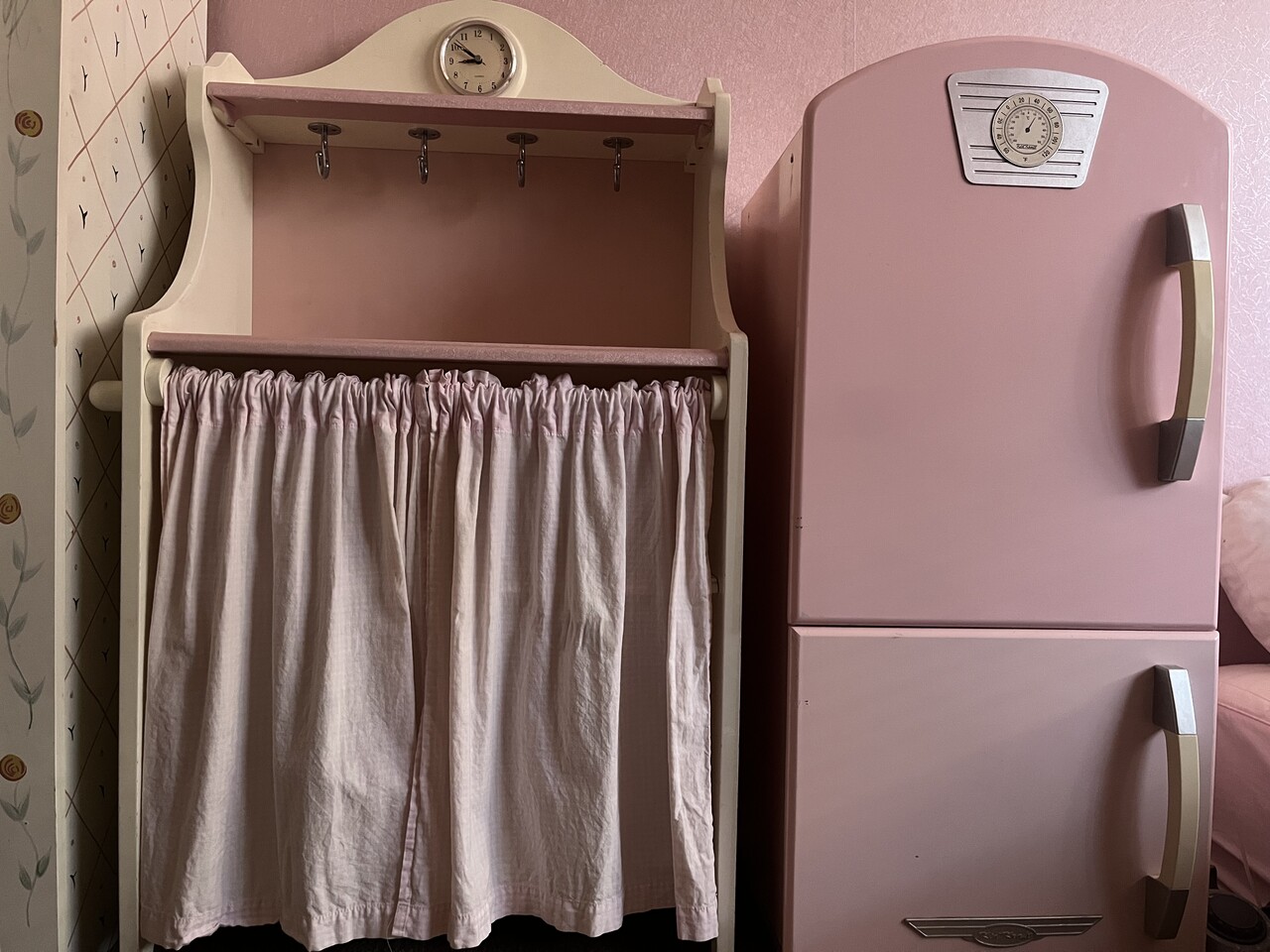 플라스틱이 아닌 나무로 된 아이들 소꿉놀이 냉장고와 책장입니다