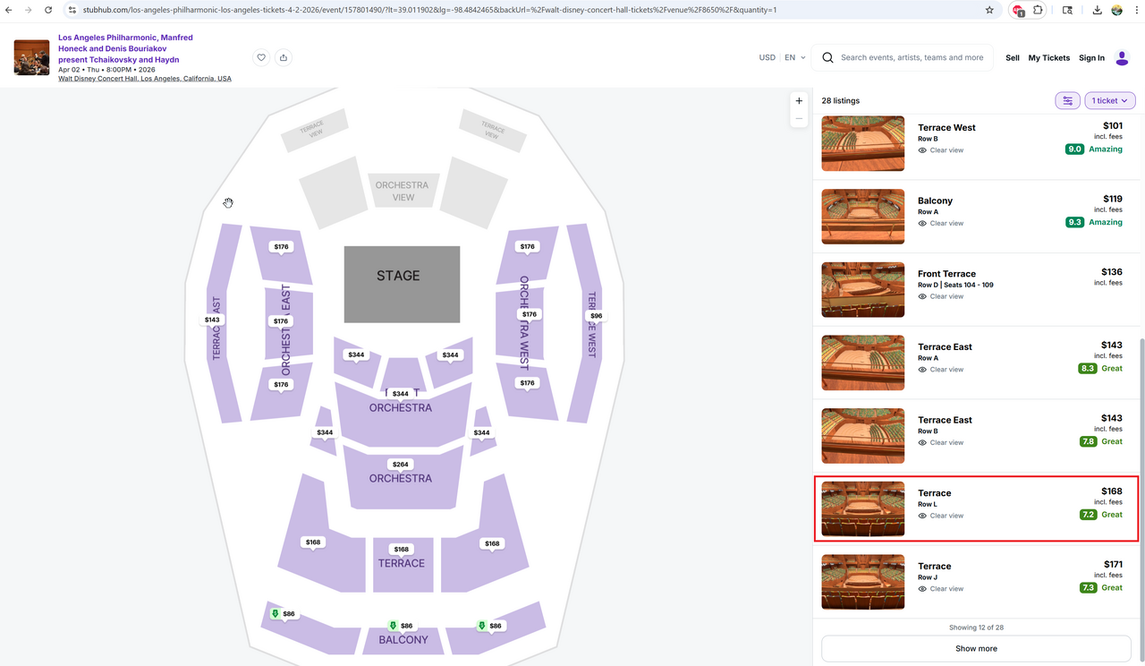 Terrace 섹션의 Row L 101-105 좌석표를 각 $80에 드립니다. 첨부된 화면캡쳐 사진들을 보시면 아시겠지만 L열은 LA Phil에서는 $112, Stubhub에서는 $168, Vividseats에서는 $180에 판매되고 있습니다.