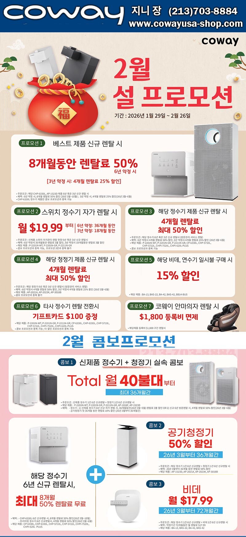 1. 카운터탑 냉온정수기(CHP6330L) 또는 멀티액션 공기청정기(AP1523D) 6년 렌탈시 8개월 50% 할인
