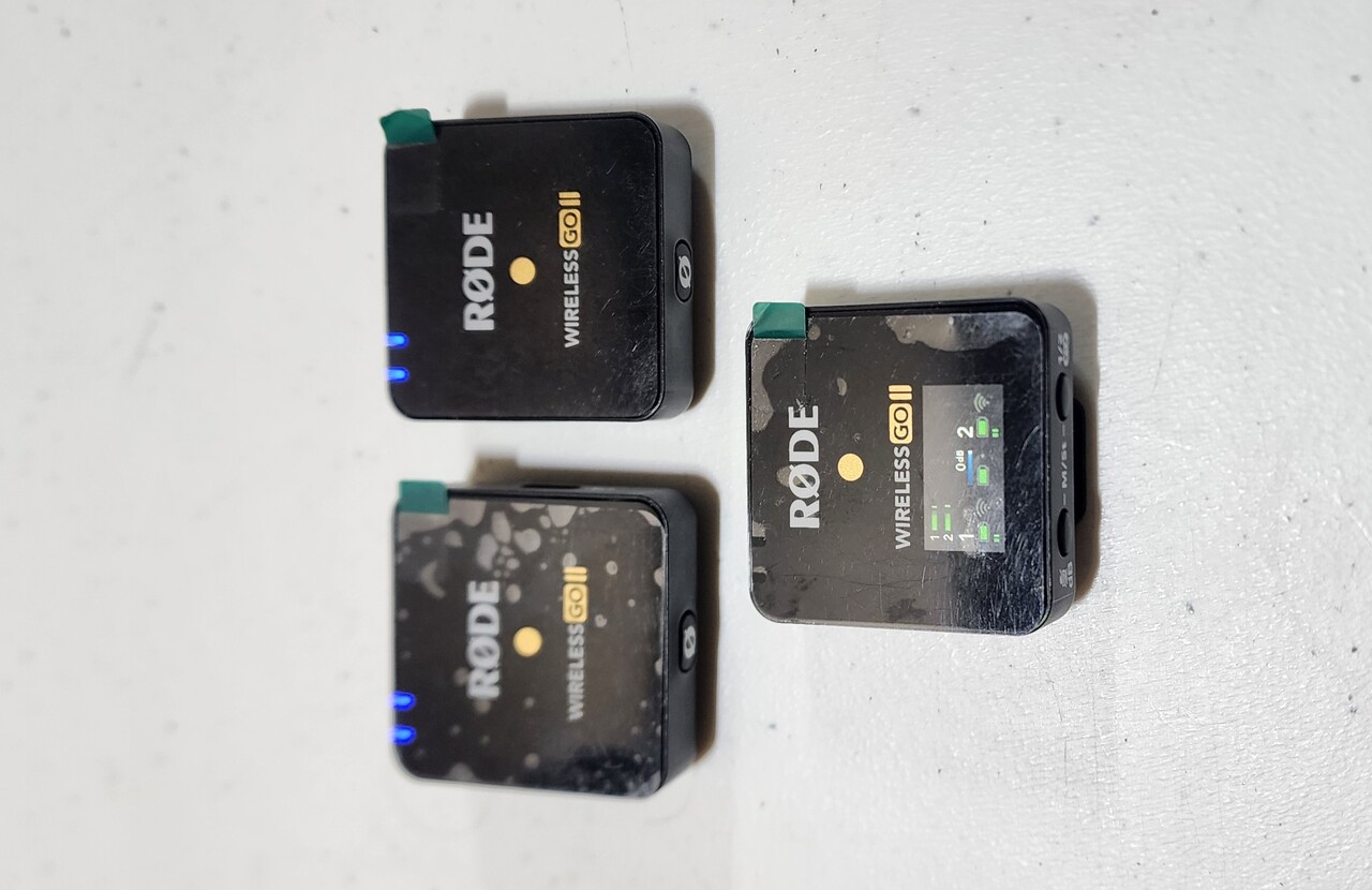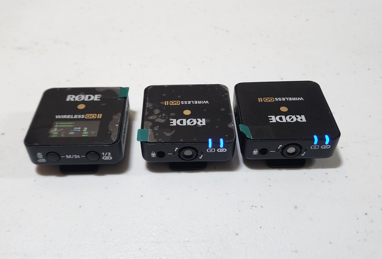 구성: 사진은 수신기(RX) 1대(왼쪽 LCD 화면 장치)와 송신기(TX) 2대(오른쪽 두 장치)로 구성된 듀얼 세트를 보여줍니다.