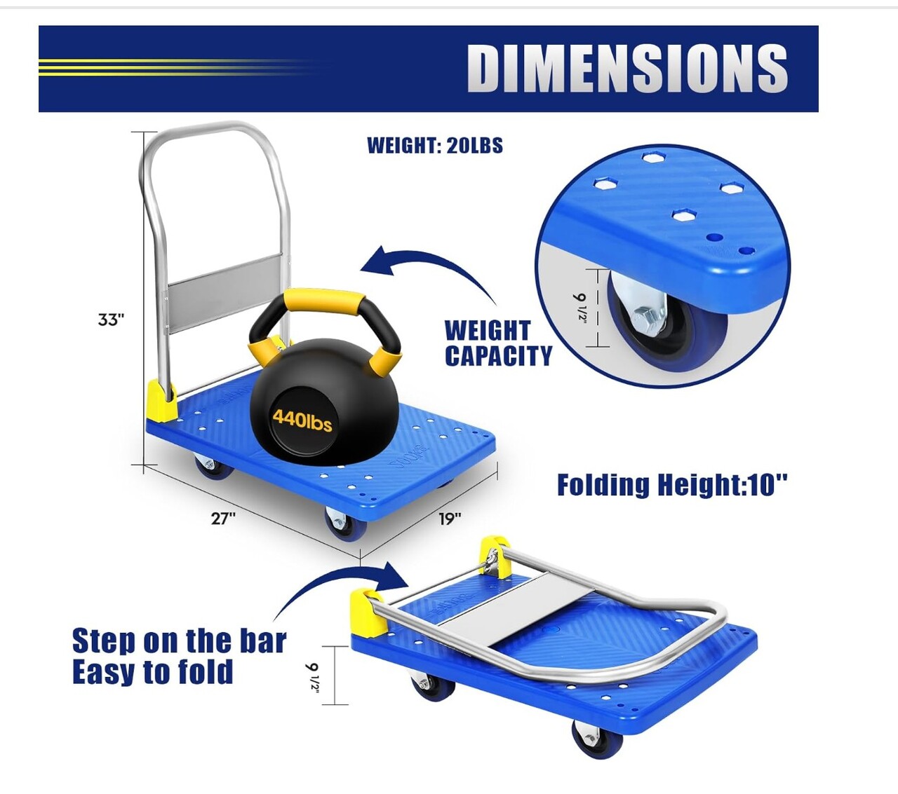 접이식 푸시 카트, 4륜 플랫폼 카트, 최대 200kg 하중 지지, 손잡이 포함, 360도 회전 가능 (파란색)