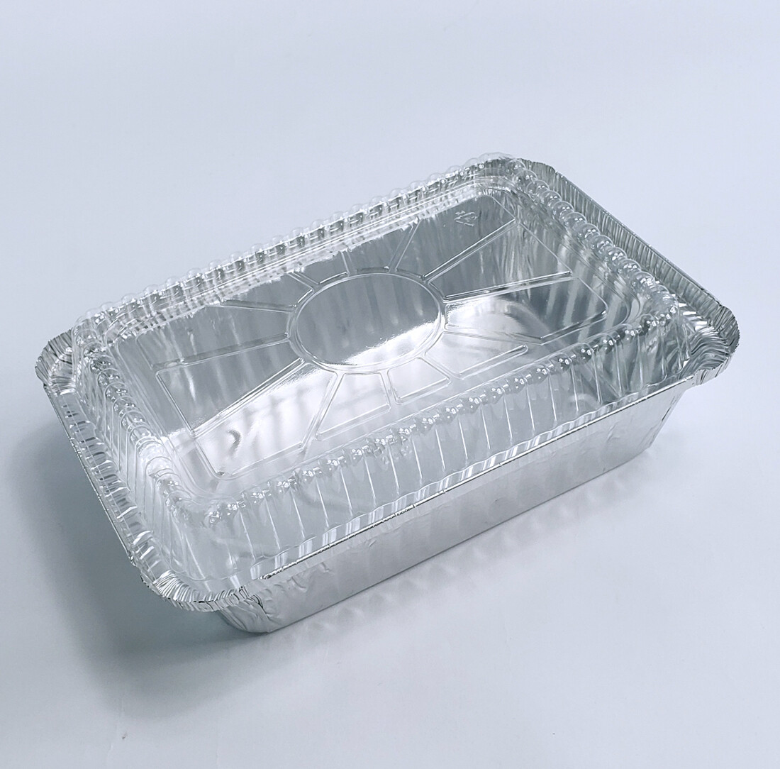Takeout-sized aluminum pans with clear plastic lids.
