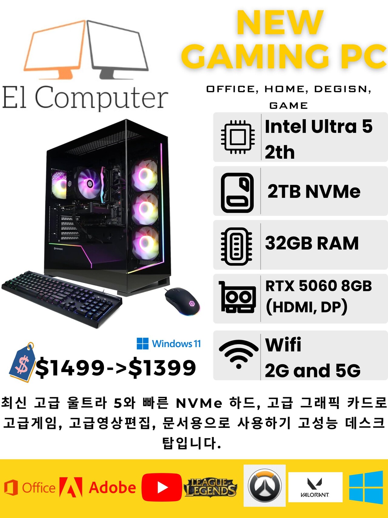최신 고급 울트라 5와 빠른 NVMe 하드, 고급 그래픽 카드로 고급게임, 고급영상편집, 문서용으로 사용하기 고성능 데스크탑입니다.
