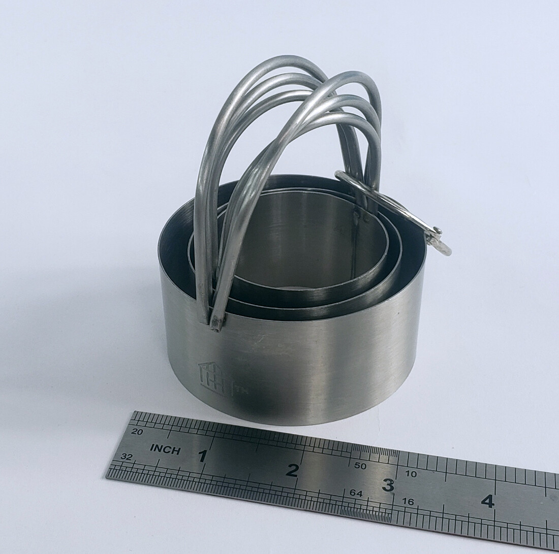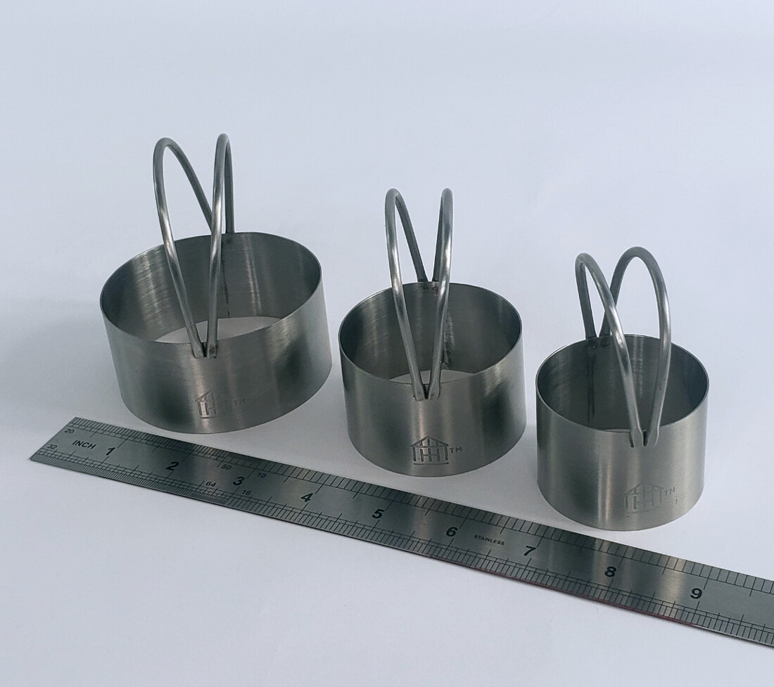 둥근 모양 쿠키 커터 세트. 모두 3개이며, 스테인레스 재질입니다. 튼튼하고 묵직해서 반죽으로 부터 모양을 쉽게 낼 수 있고, 보관하기 편하도록 3개를 묶어 걸어 둘 수 있도록 둥근 금속 고리가 있습니다.