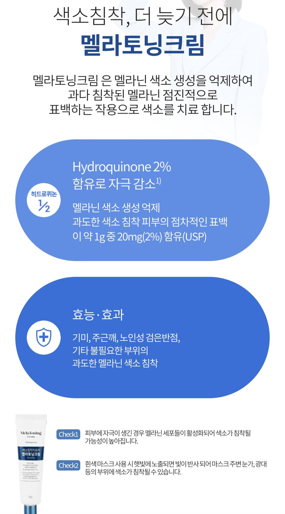 큰사이즈예요. 이건 자기전 소량 바르고 낮에 꼭 선크림 발라야 합니다 색소침착 부위에만 톡톡찍어 발라주세요! 바르는 부위가 전체 피부의 10% 초과하지 않아야 합니다. 넓은 부위에 바르면 자극이 될 수 있어요 자외선 차단제를 바르는 이유는 표백된 피부를 보호하고 재발을 방지하기 위해서입니다. 멜라토닝을 바른 피부가 햇빛에 노출되면 자극감을 느낄 수 있고, 색소침착이 재발할 수 있어요. 2027/5엘에이