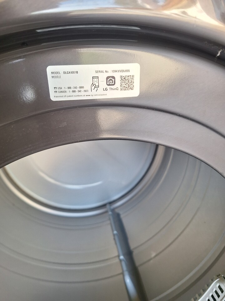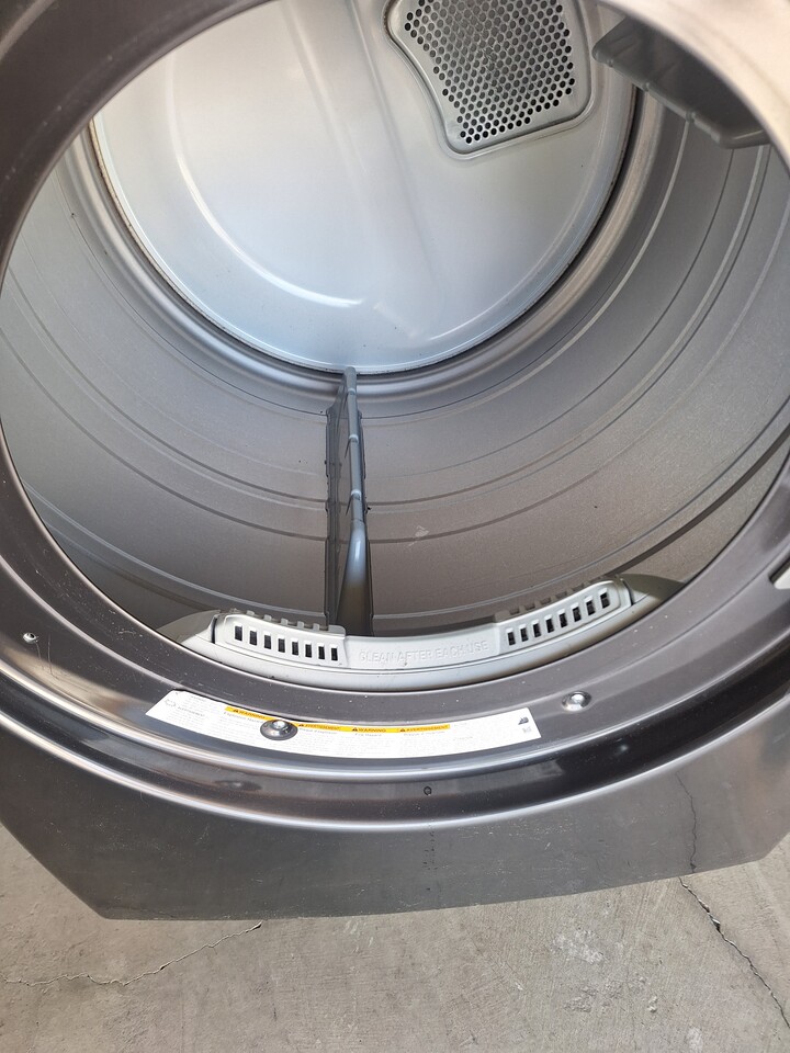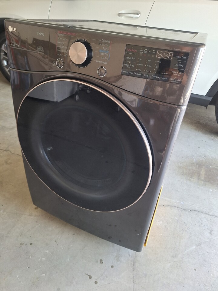 최신형 LG ThinQ SensorDry 건조기입니다. Wi-Fi 및 원격 시작(Remote Start)과 같은 스마트 기능을 탑재하고 있습니다. TurboSteam, Sensor Dry, Wrinkle Care 등 다양한 건조 코스를 제공합니다. 색상은 다크 그레이입니다.