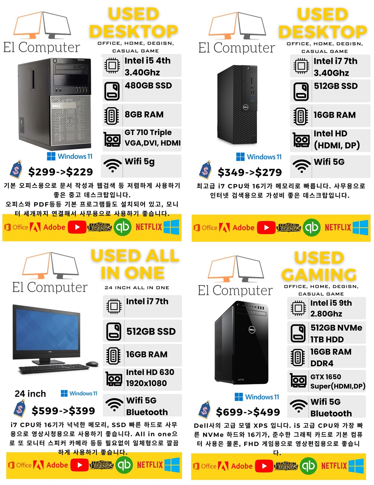 New 검퓨터는 물론, 중고 컴퓨터들(윈도우, 맥)도 좋은 컨디션에 프로그램 설치와 최적화되어서 최저가에 판매합니다. “비즈니스란에 컴엘258”로 검색하셔서 가격링크 비교해보세요.