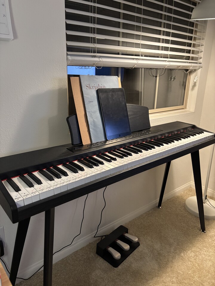 페달, 건반 닦는 천, 악보클립, 피아노 커버 포함입니다.  (헤드셋은 고장났지만 연결 포트는 살아있어서 다른 헤드셋으로 연결하여 사용 가능합니다). 건반에 key sticker 부착되어있습니다.