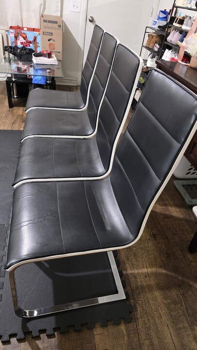 의자: 인조 가죽 부분이 세월이 지남에 따라 갈라지거나 벗겨진 곳이 있습니다. 앉았을 때의 착석감은 여전히 ​​편안하며, 아마존 등에서 의자 커버를 구매해 씌우시면 새것처럼 깔끔하게 연출하실 수 있습니다!