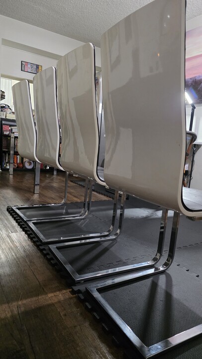 (4) 캔틸레버형 다이닝 의자: 세련된 C자형 크롬 프레임에 블랙 인조 가죽 좌석과 화이트 테두리 마감이 돋보입니다. (규격: 길이 15.75인치 x 너비 18인치 x 높이 39인치)