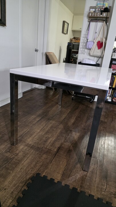 (1) 모던 슬림형 다이닝/콘솔 테이블: 화이트 하이글로시(고광택) 마감에 묵직한 크롬 소재의 U자형 다리가 특징입니다. 구조가 매우 튼튼합니다. (규격: 길이 55인치 x 너비 17.75인치 x 높이 30인치)