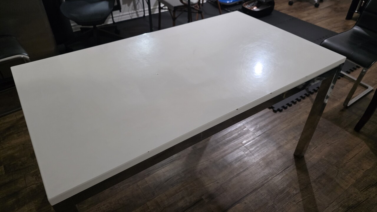 테이블: 화이트 유광 마감된 모서리 부분에 눈에 띄는 긁힘 자국이 일부 있습니다.