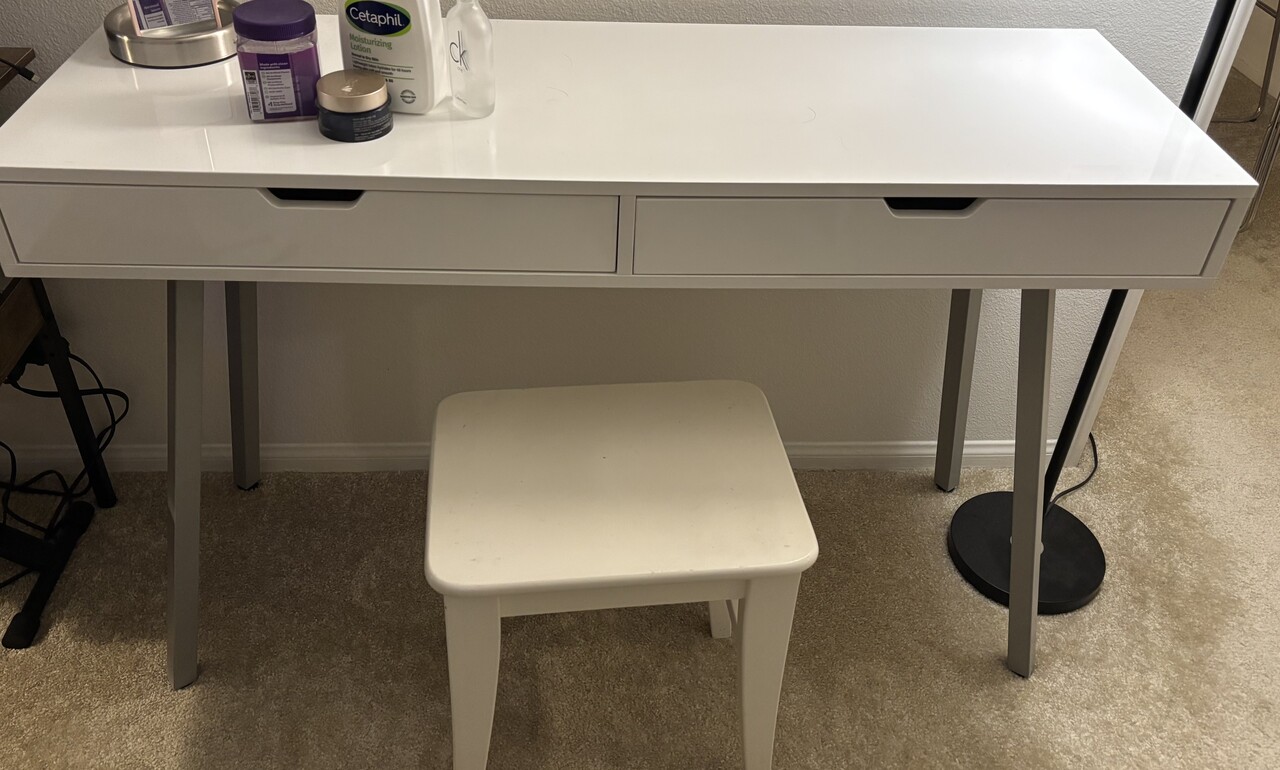 서랍 2개 달린 화장대, 의자 및 거울 포함입니다. (거울은 벽걸이입니다)