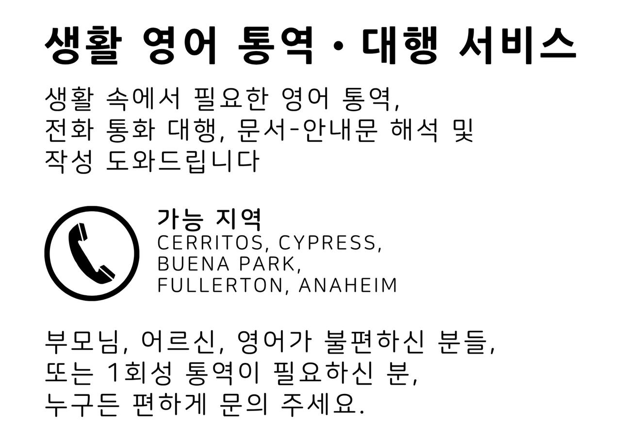 생활 속에서 필요한 영어 통역, 전화 통화 대행, 문서·안내문 해석 및 작성 도와드립니다.