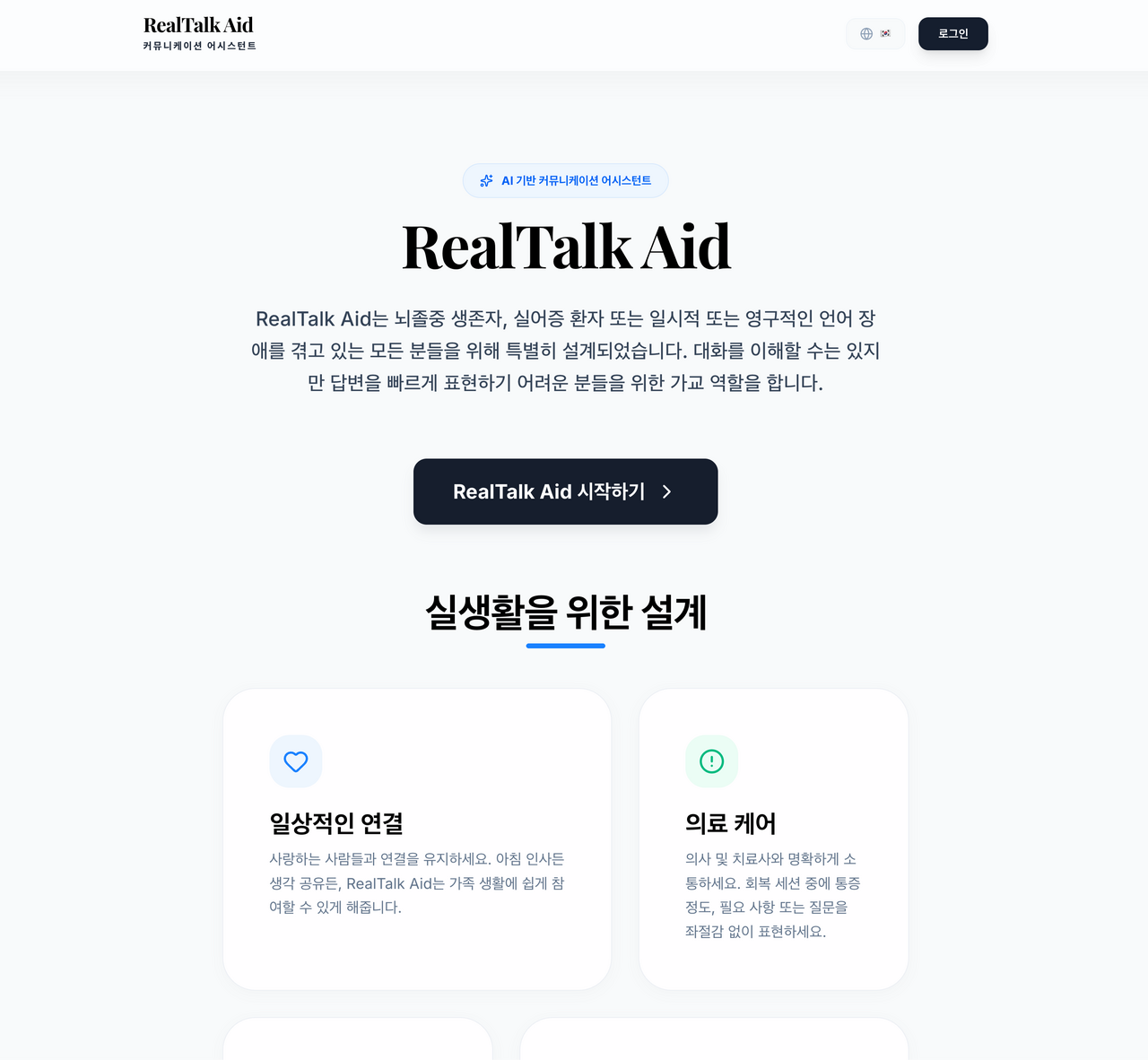 뇌졸중 생존자와 실어증 환자를 위해 특별히 설계된 RealTalk Aid는 생각과 발화 사이의 간극을 메워줍니다. 이번 2.0 업데이트에서는 압도적인 응답 속도(Lightning-fast speed)와 프리미엄 UI를 최우선으로 반영했습니다. 이제 대화의 흐름을 놓치지 않고, 일상의 속도에 맞춰 소통할 수 있습니다.