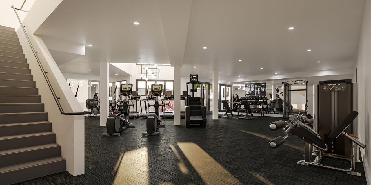 실내-실외 트레이닝 구역이 있는 2층 피트니스 센터