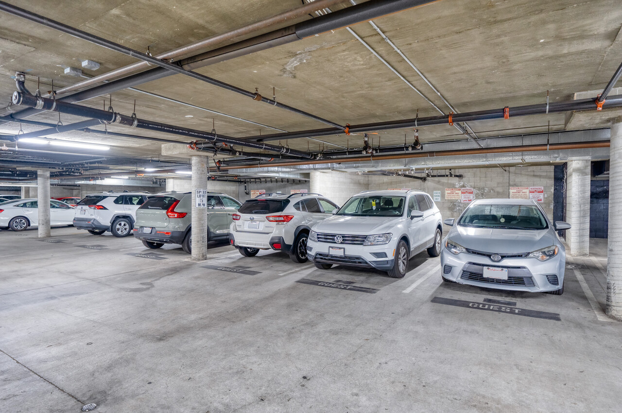 The private master suite includes a full bathroom and two closets, including a large walk-in. Enjoy a private balcony with tree views, central A/C, and secured two gated parking spaces with elevator access to the entry level.