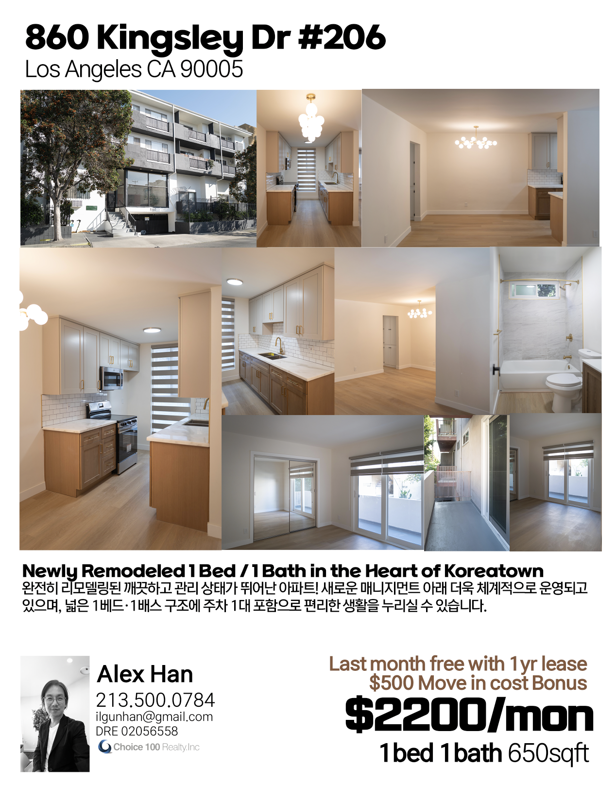 완전히 리모델링된 깨끗하고 관리 상태가 뛰어난 아파트! 새로운 매니지먼트 아래 더욱 체계적으로 운영되고 있으며, 넓은 1베드, 1배스 와 2배드 2배 스!주차 1대 포함입니다.