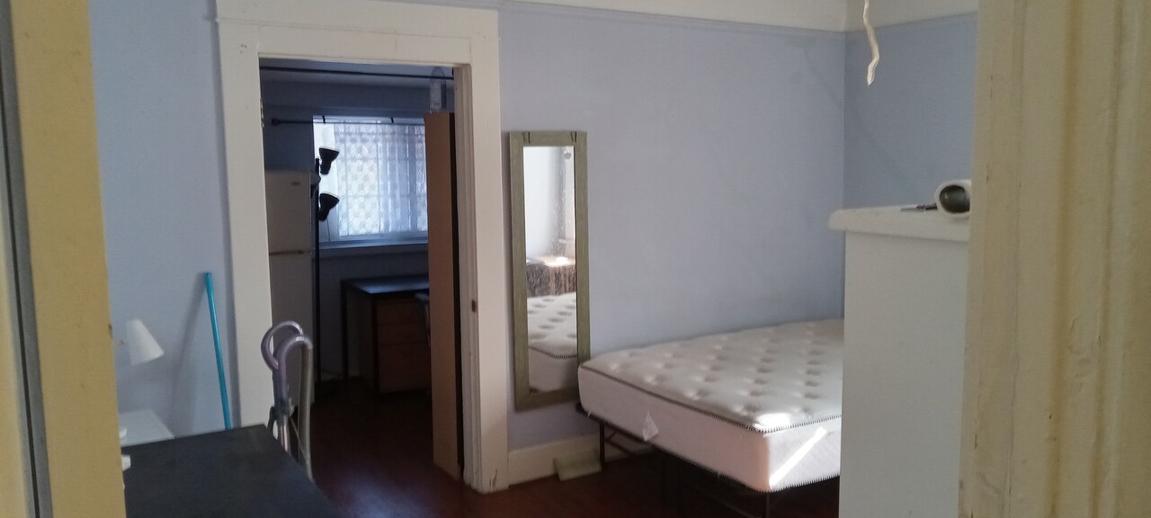 침대, 냉장고, 마이크로오븐, 탁자, 옷서랍, 옷장,