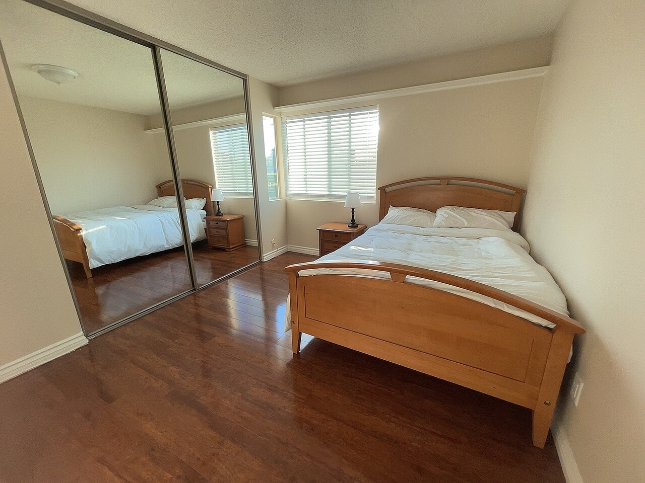 풀 사이즈침대와 고급 폼매트리스, 시트, 이불, 베개 등 모두 갖춰둠. 큰 책상, 수납함, 의자 등등