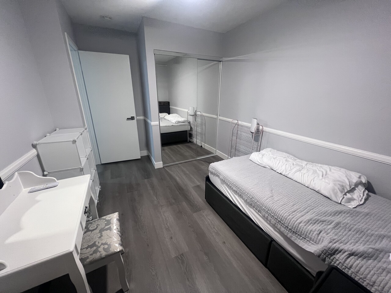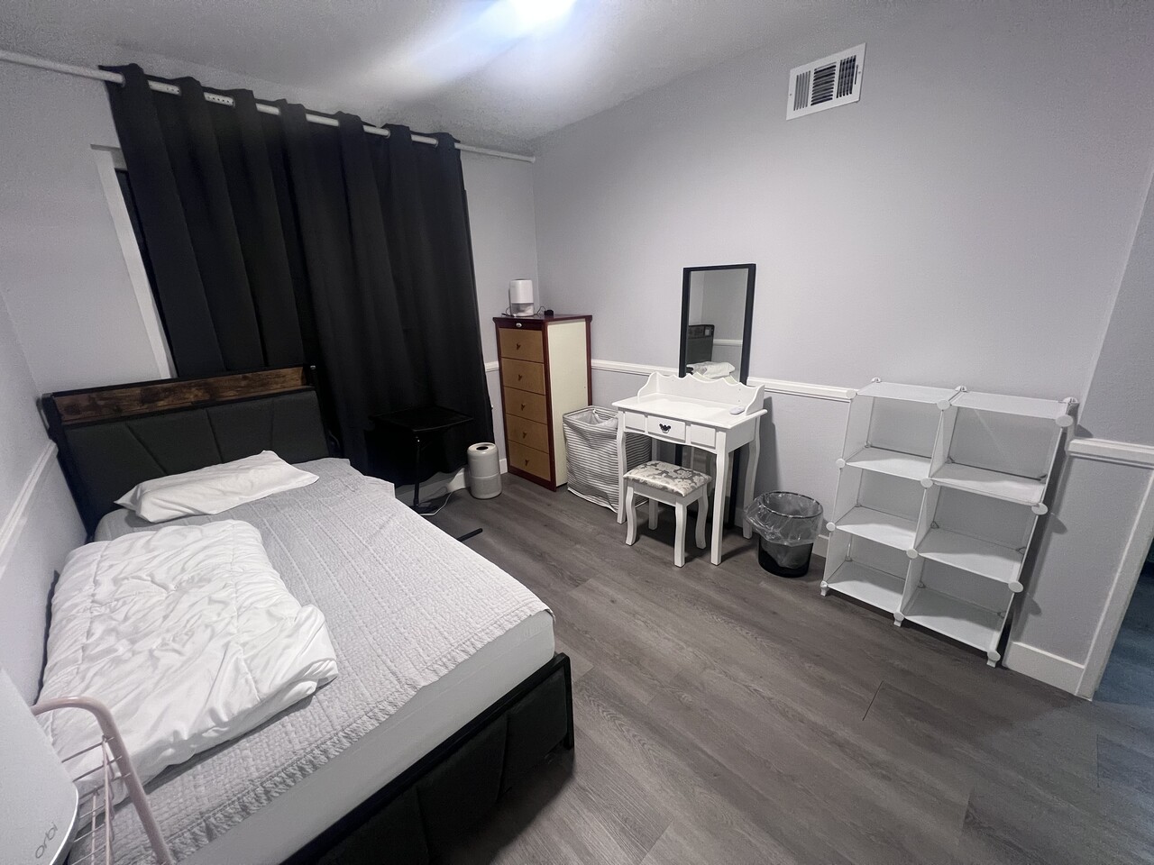 방 안에는 침대, 서랍장, 화장대 거울이 있고,