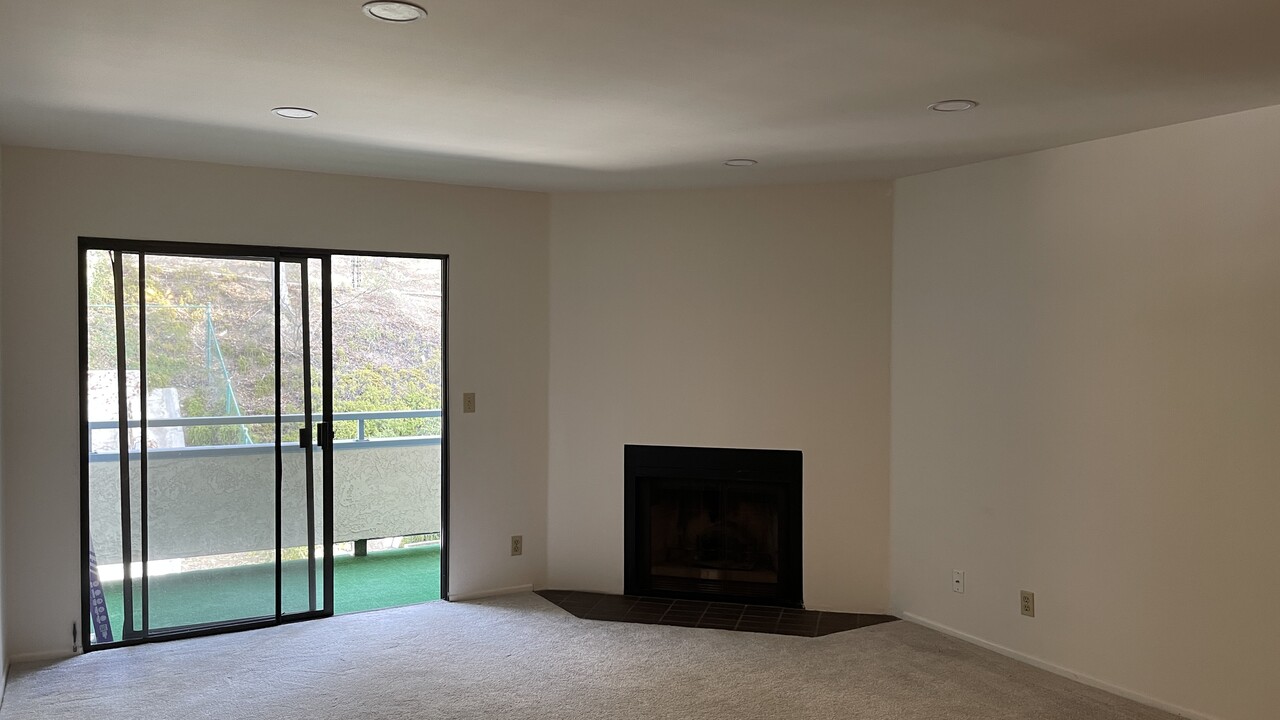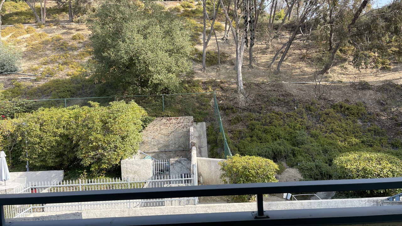 베란다에서 나무로 우거진 언덕이 보여요.