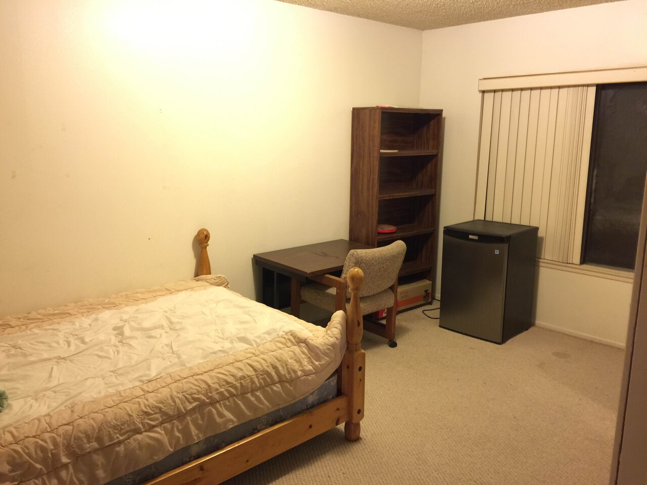 침대, 침구류, 옷장, 책상, 작은 냉장고, 세탁기 & 마이크론 오분 완비