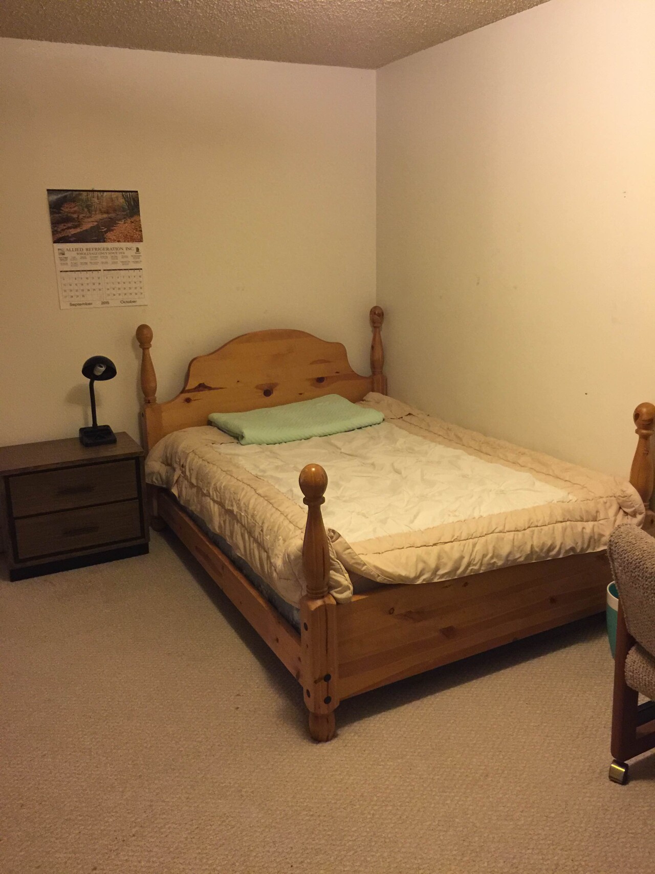 침대, 침구류, 옷장, 책상, 작은 냉장고, 세탁기 & 마이크론 오분 완비