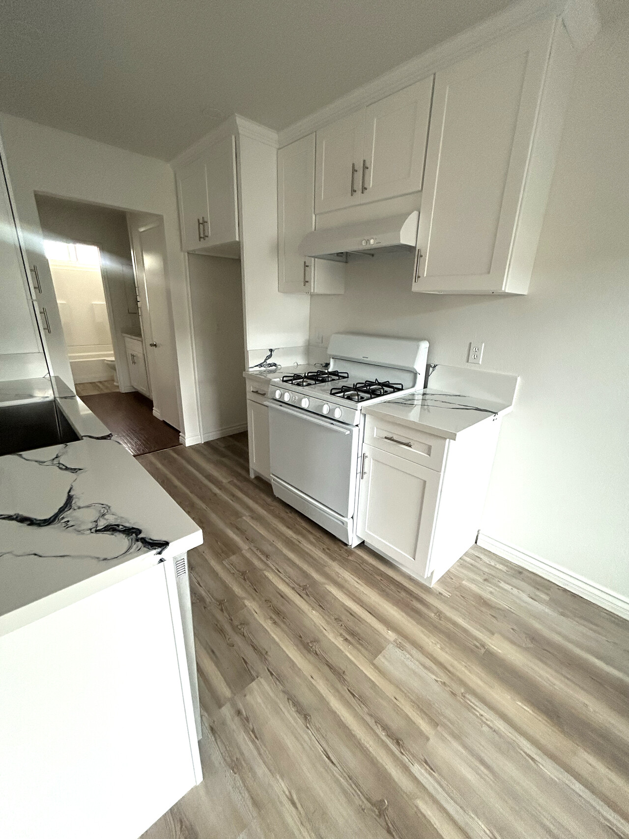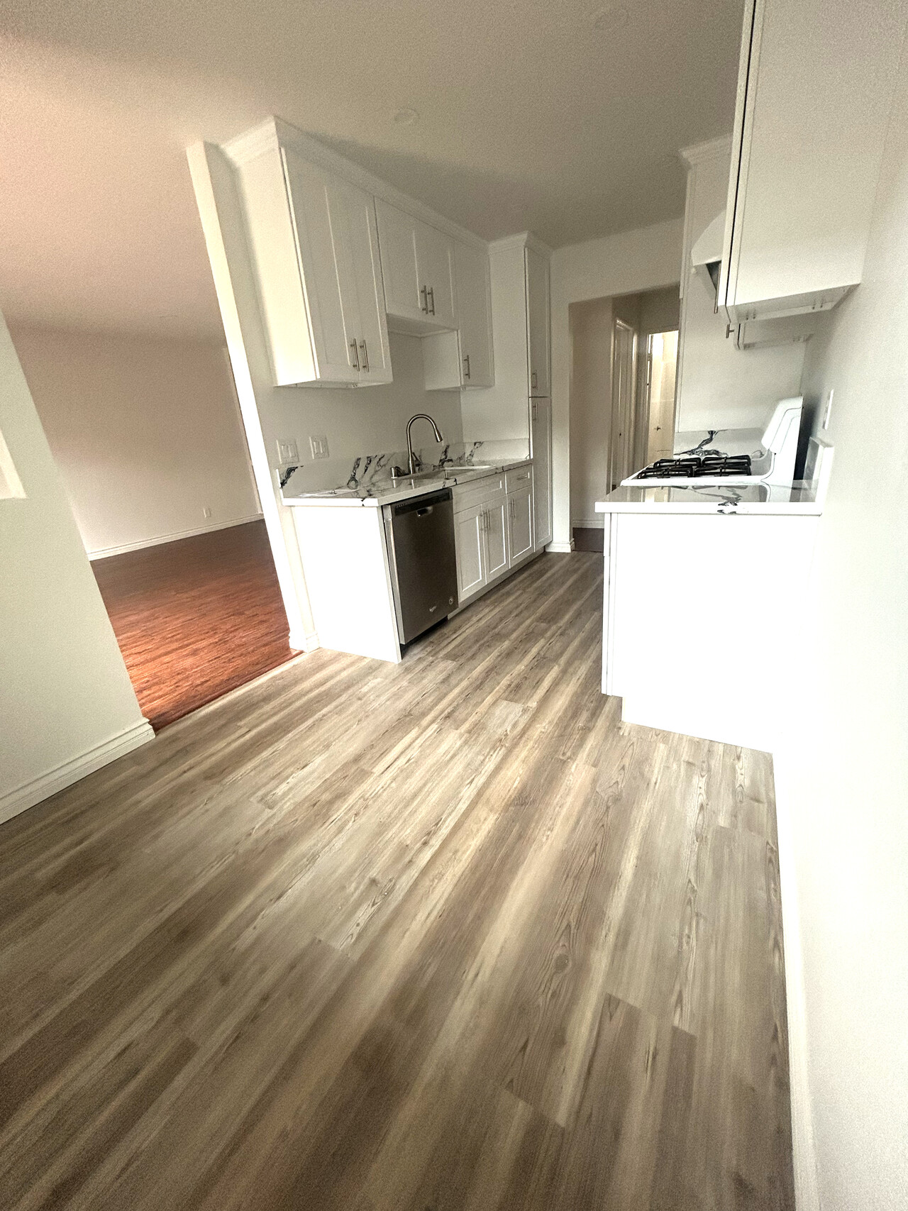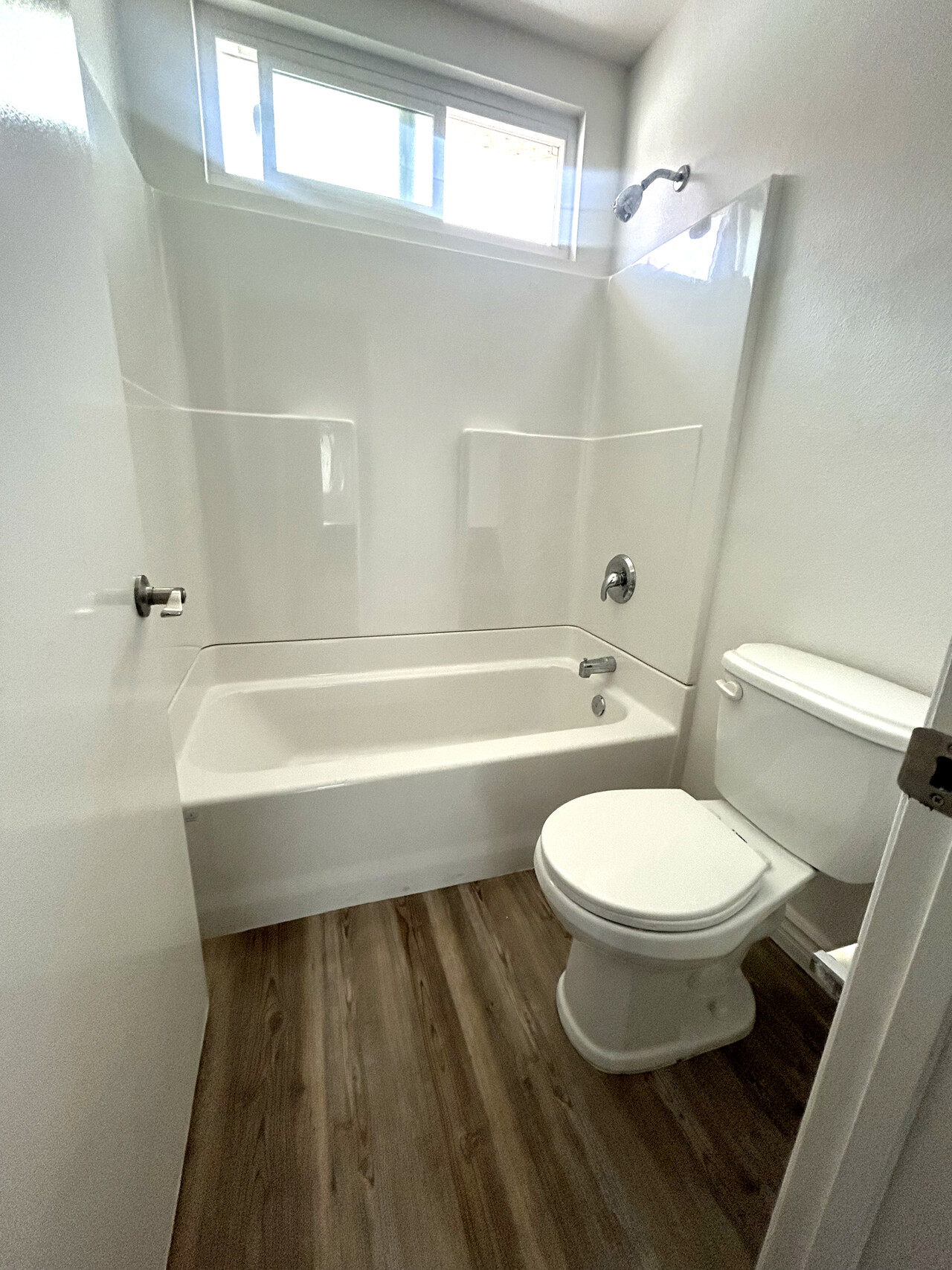 New paint, New kitchen cabinets, New bathtub and hardwood floor.