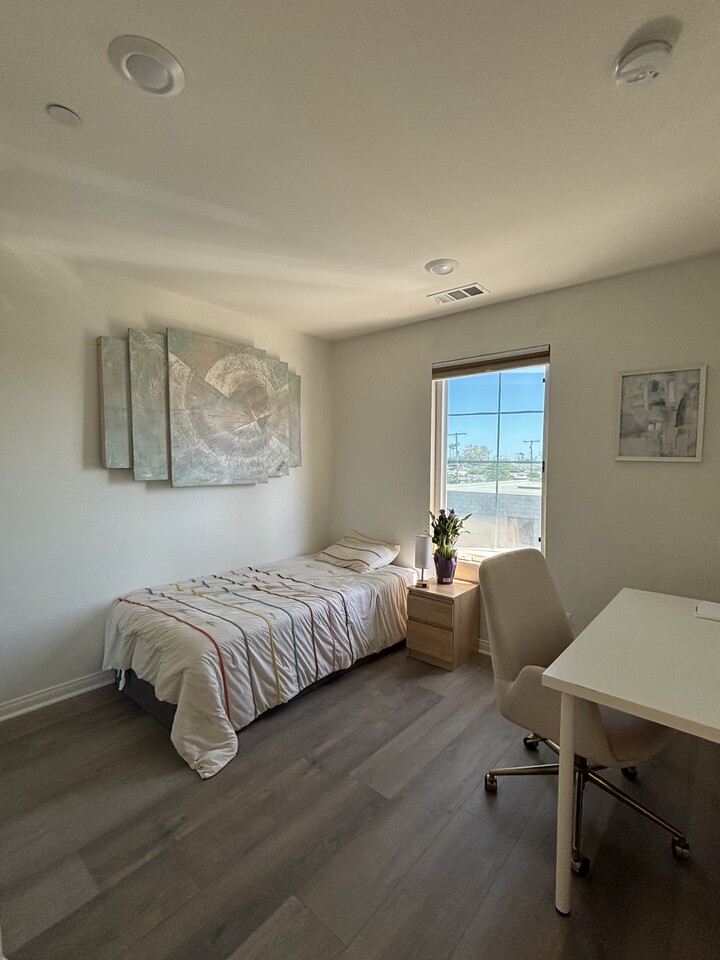 - 기본 가구 완비: 침대 프레임, 매트리스, 책상, 의자, 책장. 방 인테리어 예뻐요.