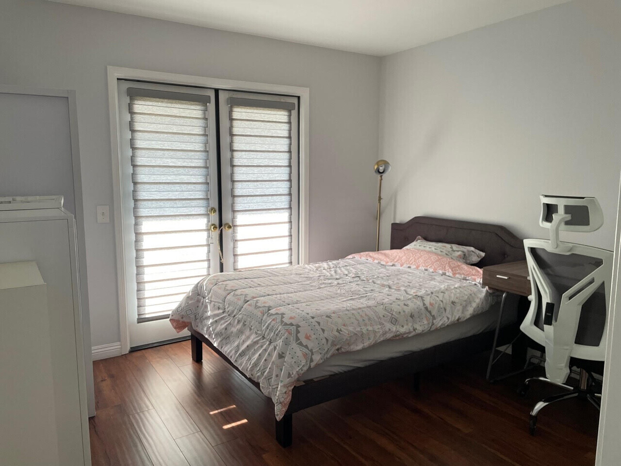 방에 Patio, 침대, 책상, 책꽂이, 서랍장, 공기청정기, 작은 냉장고 (냉동/냉장), 침구, 옷걸이가 구비되어 있으며