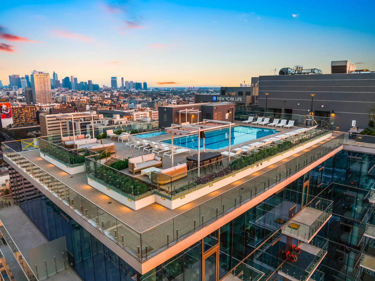The building features a stunning rooftop with one of the best views and nightscapes in LA, including a pool, jacuzzi, and BBQ area. The BBQ grills are professionally cleaned daily and are always in excellent condition. You can also enjoy resort-style sunbeds at any time.