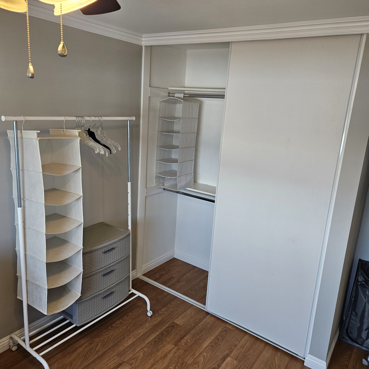 방에는 침대, 매트리스, 책상, 옷장, 행거, 거울까지 모두 구비되어 있습니다.