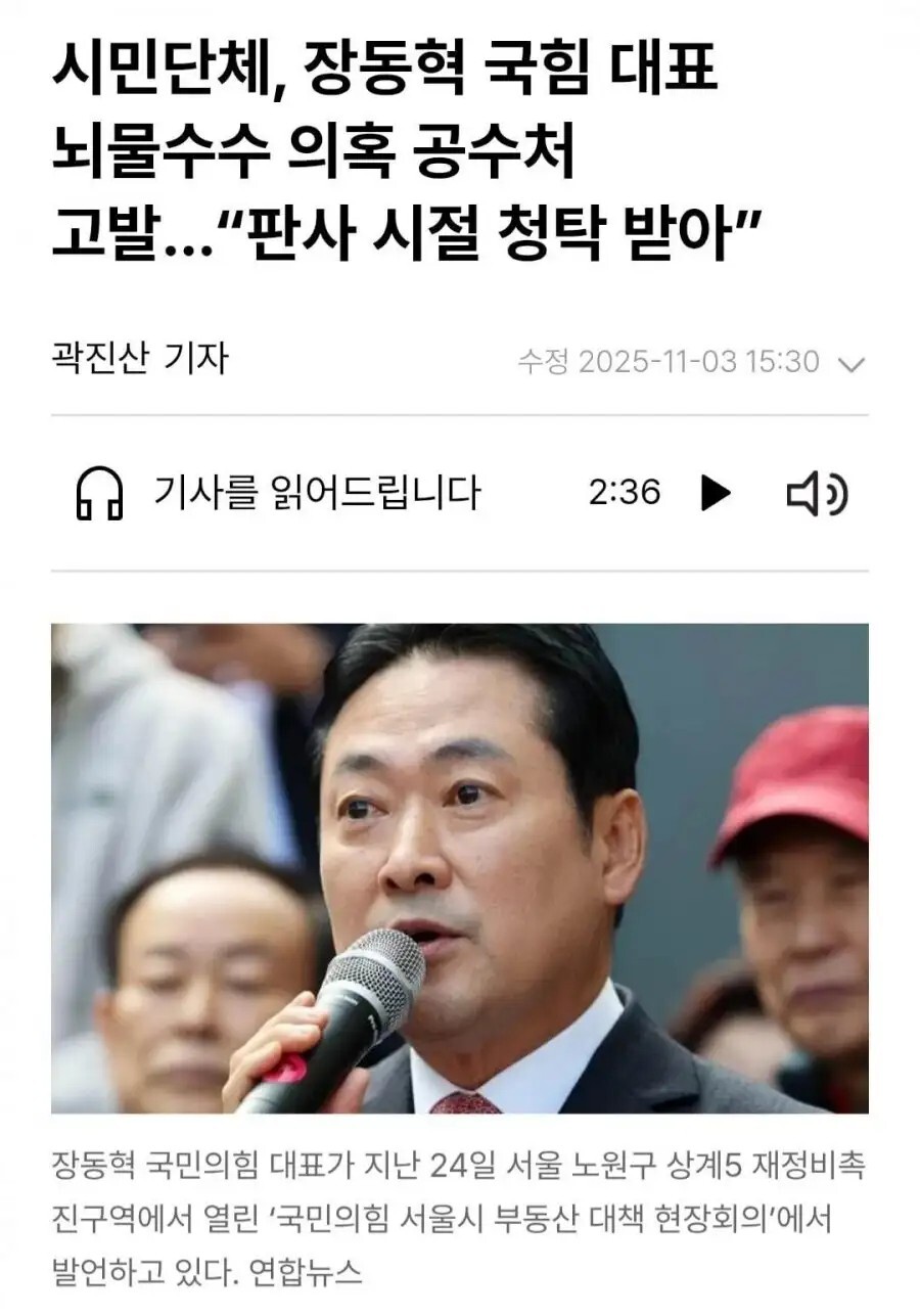 장동혁 국민의힘 대표가 판사 시절 친분 있던 변호사에게서 ‘사건 청탁’을 받았다는 의혹과 관련해 뇌물수수 등 혐의로 고위공직자범죄수사처(공수처)에 고발됐다.