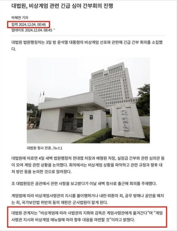 작년 12월 4일 새벽 00시 46분 조선일보는 대법원 관계자의 발언을 인용해 다음과 같이 보도했습니다. “비상계엄에 따라 사법권의 지휘와 감독은 계엄사령관에게 옮겨간다”, “계엄사령관의 지시와 비상계엄 메뉴얼에 따라 향후 대응을 마련할 것”이다. 당시 대법원은 내란 성공을 전제로 계엄사령관의 지시에 순순히 따르려고 했습니다. 국회의 계엄 해제가 이뤄지기 전까지의 급박한 상황들로 인해 대법원의 이 회의는 부각되지 못했지만, 조선일보 보도는 중요한 단서를 제공합니다.