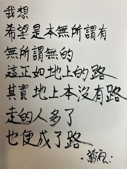 我想:希望是本無所謂有,無所謂無的。這正如地上的路;其實地上本沒有路,走的人多了,也便成了路
