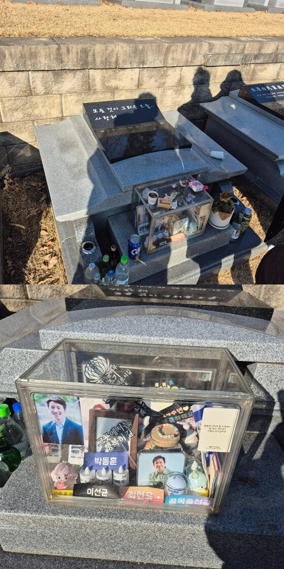 윤희석이 공개한 이선균 묘비에는 '모든 것이 그리운 오늘.. 사랑해'라는 문구가 새겨져 눈길을 끌었다.